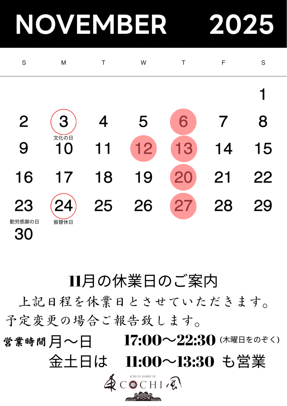 ◆11月の営業日カレンダー◆ 11/13(水)臨時休業