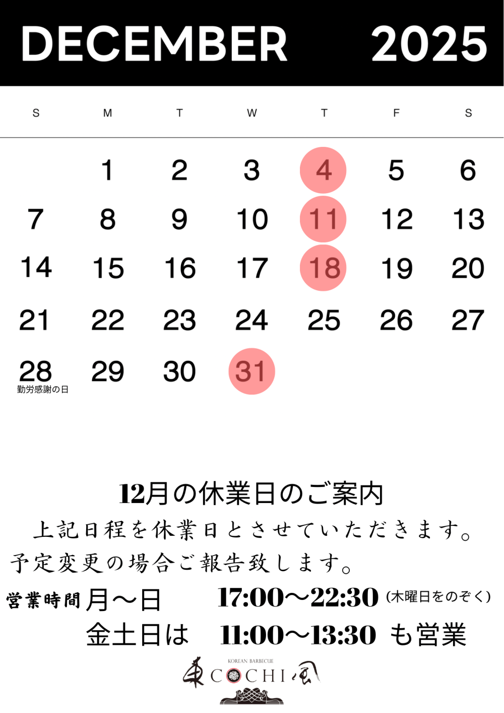 ◆12月の営業日カレンダー◆12/25(木)は営業・12/31(水)は休業