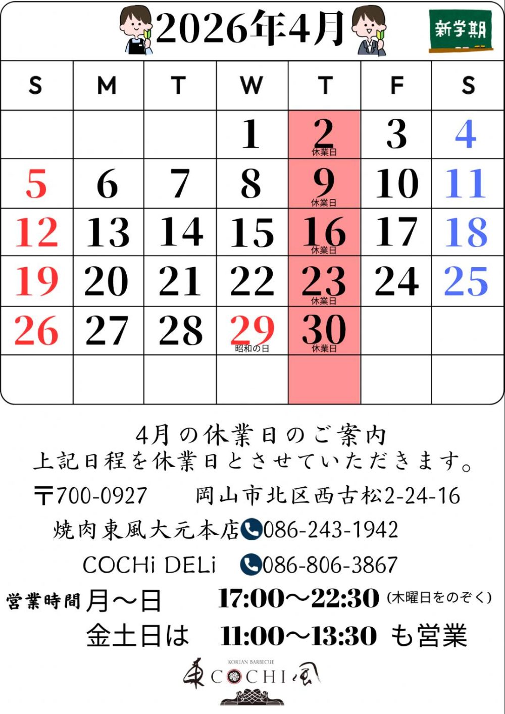 ◆5月の営業日カレンダー◆5/1(木)は営業・5/14(水)は臨時休業
